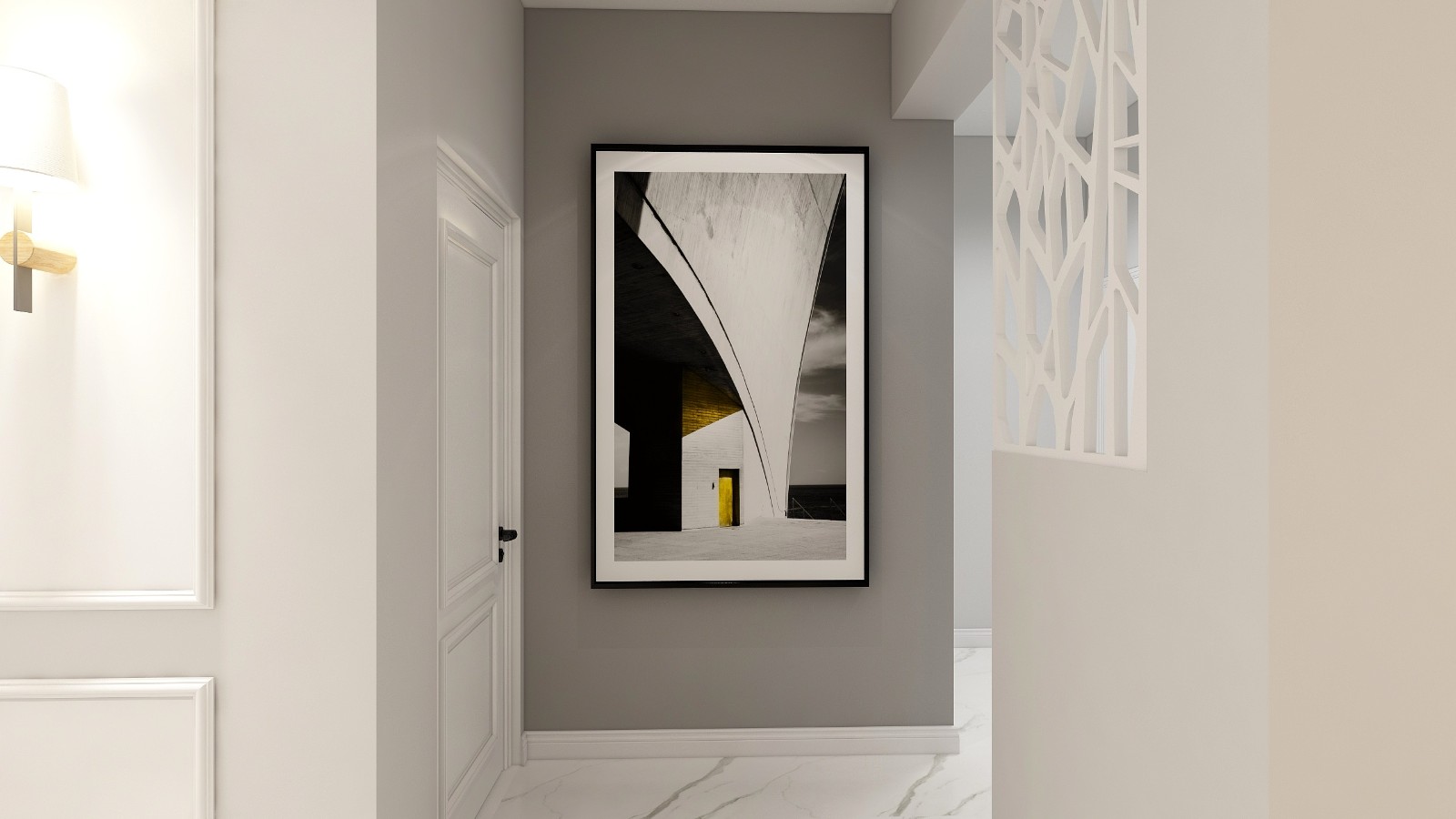 淺灰色的背景墻面漆,時尚動感的簡約風掛畫,十分具有現代風。一絲工業元素的棕灰色沙發搭配黑色的茶幾,深灰色加入一抹亮色黃,使空間的流行元素渲染出來。